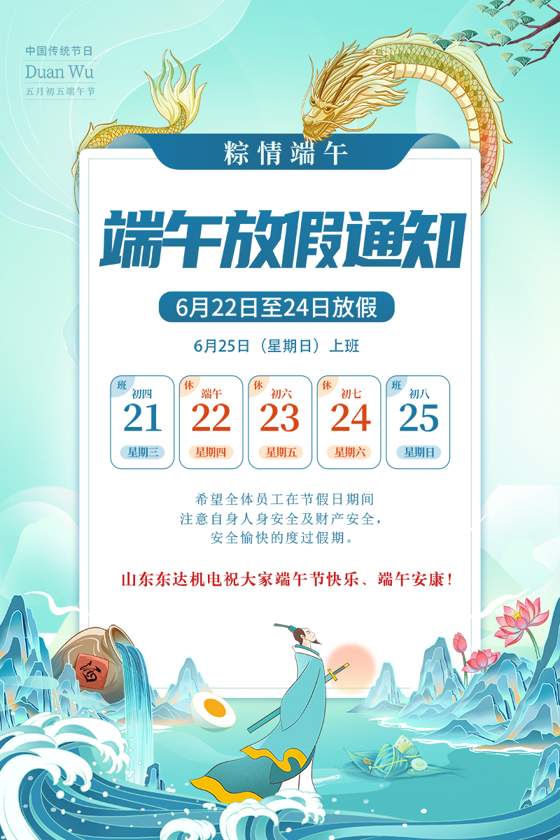 根據(jù)《國(guó)務(wù)院辦公廳關(guān)于2023年部分節(jié)假日安排的通知》,結(jié)合我公司的實(shí)際情況端午節(jié)放假時(shí)間通知如下:6月22日(星期四)——6月24日(星期六)放假,共3天,6月25日(星期日)正常上班。