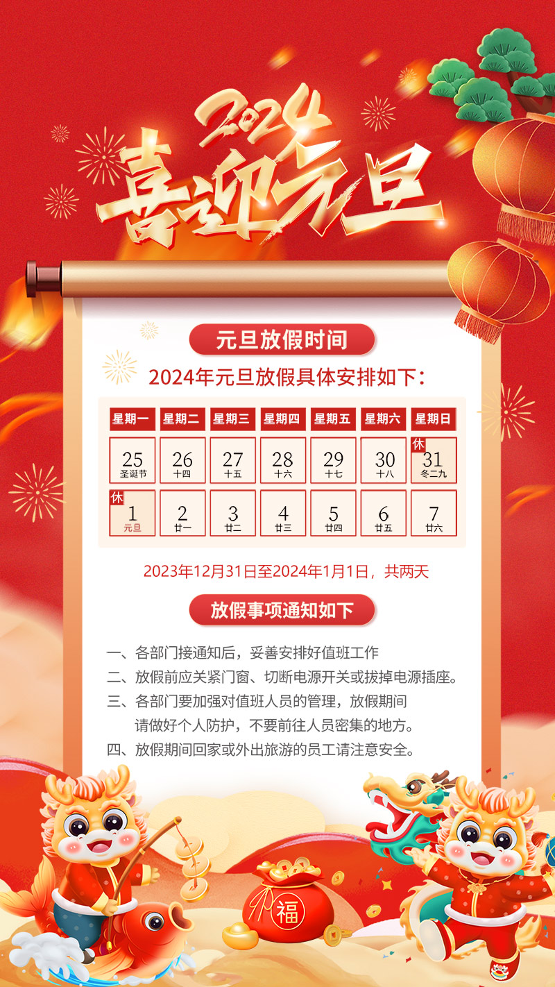 根據《國務院辦公廳關于2024年部分節(jié)假日安排的通知》,結合我公司的實際情況,現將我公司2024年元旦放假具體安排如下: