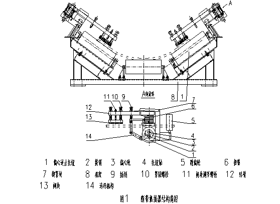 斷帶抓捕器(見圖1)主要由偏心逆止托輥1、轉(zhuǎn)臂12、閘塊13、楔緊塊7、扭簧6、閘塊調(diào)節(jié)螺栓11、插銷9、連桿機構(gòu)14等組成。托輥內(nèi)有偏心輪3、托輥軸4以及轉(zhuǎn)動機構(gòu),當輸送機正常工作時,偏心逆止托輥與膠帶不接觸,一旦輸送機發(fā)生斷帶或逆止器失效時,膠帶下滑,偏心逆止托輥與膠帶接觸,在摩擦力的作用下與偏心輪一起反轉(zhuǎn),旋轉(zhuǎn)中心是托輥軸圓心,撥銷也隨同偏心輪一起轉(zhuǎn)動,撥動連桿機構(gòu)的上插板向下運動,使插銷脫開,在扭簧的作用下轉(zhuǎn)臂迅速打向楔緊塊至輸送帶上方并楔緊,同時托輥也擠向閘塊,隨著輸送帶的下滑越來越擠緊輸送帶,迅速將下滑的重段膠帶抓捕,保護輸送帶。